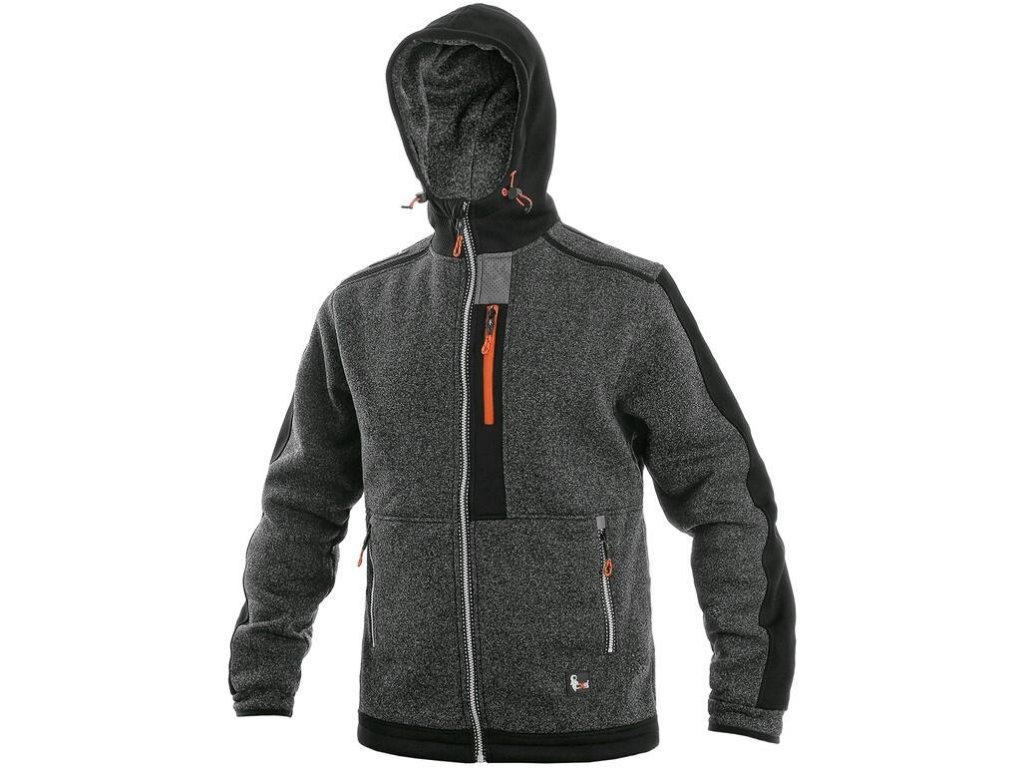 Pánska bunda z pleteniny, kombinácia materiálov, kapucňa napevno, doplnky v kontrastnej oranžovej farbe, sťahovanie v dolnom okraji, rukávy zakončené gumičkou, reflexné doplnky, náprsné vrecko na zips, 2 spodné vrecká na zips.Dodatočné parametre